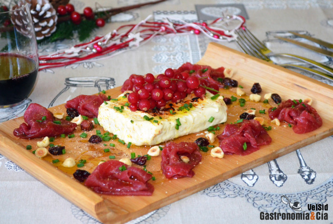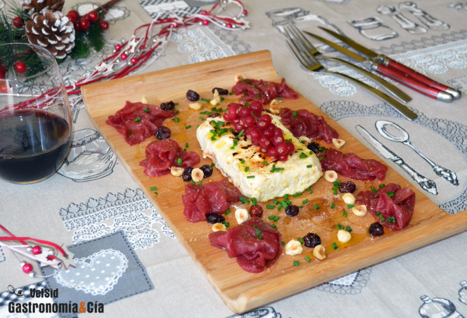 Los aperitivos pueden ser muy elaborados o muy sencillos, pero no importa por cuál nos decantemos a la hora de configurar el menú de las próximas comidas festivas, lo importante es que lo que hagamos y sirvamos, esté perfecto en cuanto a temperaturas, presentación, etc. En estas fiestas vamos a cocinar más de lo que lo hacemos normalmente, y no nos tiene que superar, todo es cuestión de elegir los platos adecuados para que lleguemos a todo, y de organizarnos mínimamente. Nosotros seguimos proporcionándoos recetas e ideas para que esto sea así, y hoy lo hacemos con un aperitivo que está para chuparse los dedos, es nuestro Queso feta a la plancha con carpaccio de buey, arándanos y avellanas.