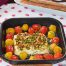 Precalienta el grill del horno con ventilador a 220º C (en su defecto, pon calor arriba y abajo a 200º C). Dispón una hoja de papel vegetal en la mesa de trabajo y coloca en el centro el queso feta una vez que lo has secado con papel de cocina absorbente.