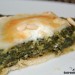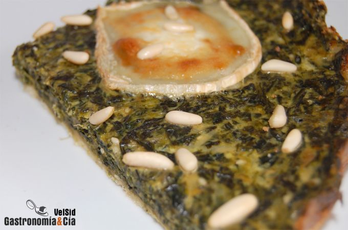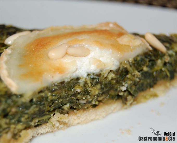 Retira del fuego las espinacas preparadas y deja que se enfríen un poco, bate los huevos con una pizca de sal e incorpóralos. Vierte el preparado en el molde con la masa quebrada prehorneada, dispón las láminas de rulo de cabra, los piñones (mejor tostados previamente) e introduce de nuevo en el horno durante 20 minutos aproximadamente, hasta que el queso se haya dorado y el relleno cuajado.