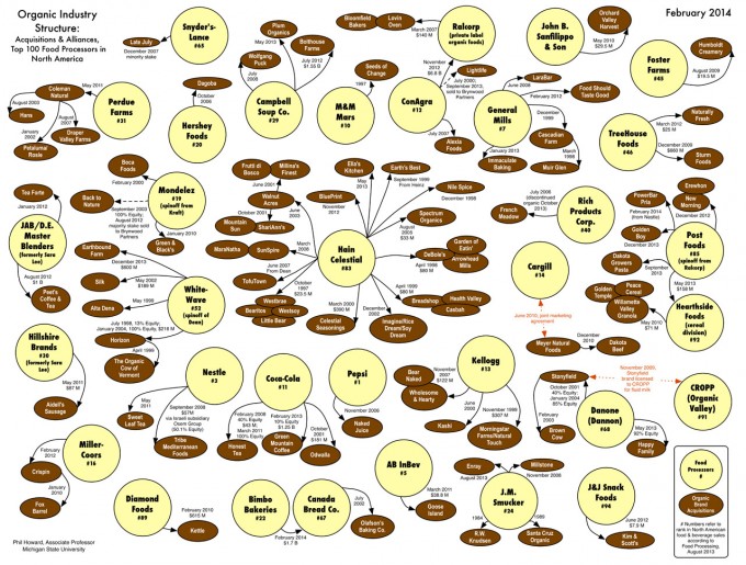 Volviendo al organigrama creado por el Instituto Cornupia, según explica Phil Howard, profesor asociado del Departamento de Sostenibilidad de la Comunidad en el Estado de Michigan (Estados Unidos), en 1995 existían 81 empresas ecológicas independientes, una década más tarde 66 habían sido adquiridas por grandes compañías alimentarias. Lo malo es que la mayoría de estas transacciones se han ocultado a los consumidores, pero la infografía muestra una instantánea de la estructura de las empresas alimentarias ecológicas, pudiendo conocer realmente y con un simple vistazo quién domina el mercado ecológico. Claro, que lo que muestra son empresas alimentarias ecológicas de Estados Unidos, pero es bastante probable que ocurra algo similar en todo el mundo.