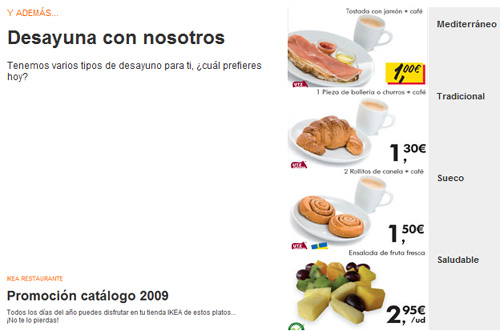 ¿Quién promueve la alimentación saludable?, esa es la primera pregunta que nos surge tras ver esta carta de desayunos. La foto que ilustra este post la hemos encontrado en la página web de Ikea, en la sección Ikea Food. Curiosamente, cualquier desayuno es bastante más barato que una ensalada de fruta fresca.