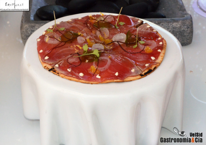 Entramos en el segundo acto del menú en el que aparecen las salazones, pero no elaborados de la forma tradicional, en lugar de cortarse con cuchillo, se untan, al menos si hablamos de la ‘Torta’ de hueva de maruca en sal al aire, bajo estas líneas os dejamos un vídeo para que veáis su preparación para la degustación. Nos encantó. Además de estas huevas, cuya presentación emula a las tortas de queso como podéis ver, nos sirvieron una también cremosa Hueva de mújol acariciada de curación y sal, un magnífico Pulpo seco a las llamas y la Tonyina de sorra reposada entre kombu de azúcar y mechoui, deliciosa. Entre bocados y para finalizar, podíamos tomar unas Cebolletas frescas encurtidas en vinagre de granada y también merece destacar el pan elegido para la hueva de maruca, el Papadum al comino. Todo ello lo degustamos con un Vino de Cádiz, La Charanga 2014. Alba Viticultores, un vino de bota vieja que pasa diez meses bajo el velo de flor, tan bueno y carnoso que da la sensación de tener que masticarlo.