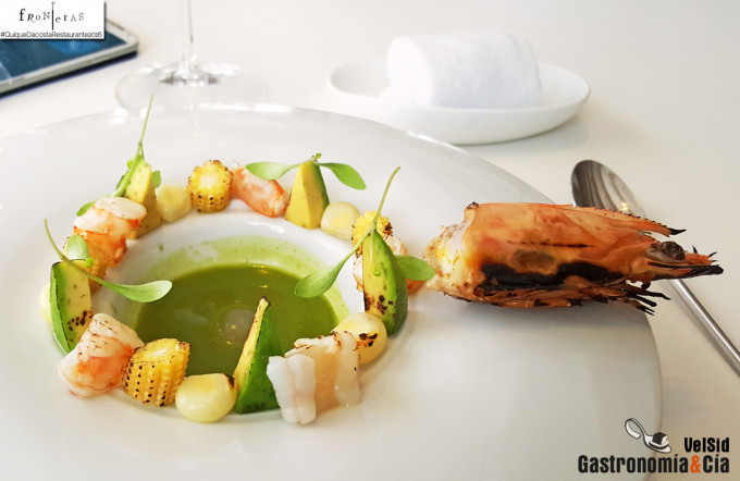 Cerramos este acto con el Langostino de Vinaròs a la parrilla, guiso de curry verde, aguacate y maíz. Todo lo que bordea el plato debe volcarse en el centro, en ese guiso de sabor intenso y ligeramente picante. Hay que mezclar y disfrutar, entonces se encuentra el equilibrio en sabores y texturas, exquisito el toque ahumado que le aportan al langostino, al aguacate… sólo le resta algo de finura al plato el grano de maíz peruano, cuya piel se queda en el paladar. Para terminar, la cabeza del langostino, que de forma majestuosa deja el sabor del mar en el paladar, con el pertinente sabor ahumado. Para acompañar este plato tomamos un Cuvee Special 2011. Domaine Montbourgeau. A.O.C L’Etolie.