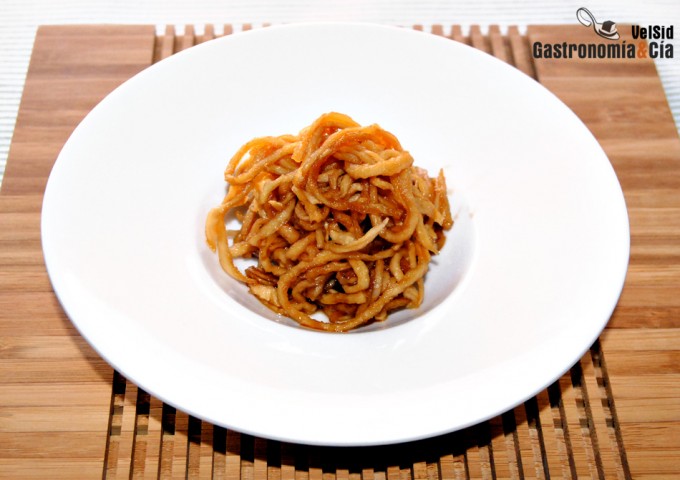Escúrrelo bien y si lo deseas, puesto que pueden ser largos hilos de rábano, córtalo más pequeño. A continuación ponlo en un tarro con tapa hermética y añade la salsa de soja, la suficiente para que el rábano se impregne y esté casi completamente cubierto, pero sin que esté nadando en líquido.