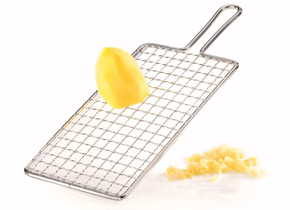 Es posible que hayáis visto hace muchos años un rallador de alambre para patatas de este estilo, quizá alguno de vosotros incluso lo conserváis. Aunque en principio no lo parezca, es un rallador práctico para preparar las patatas con el objetivo de hacer las tortitas creando una masa que se amalgama bien, las patatas deben rallarse en crudo, y también se puede utilizar con otros alimentos.