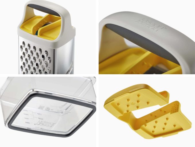 Como podéis ver en las fotos y en el vídeo bajo estas líneas, el Rallador de caja multiagarre de Joseph Joseph, incorpora un recipiente que se coloca en la base para recoger los alimentos que se rallan, y una pieza que sirve para agarrar los alimentos que se quieren rallar para aprovecharlos al máximo y especialmente para proteger los dedos de las cuchillas.