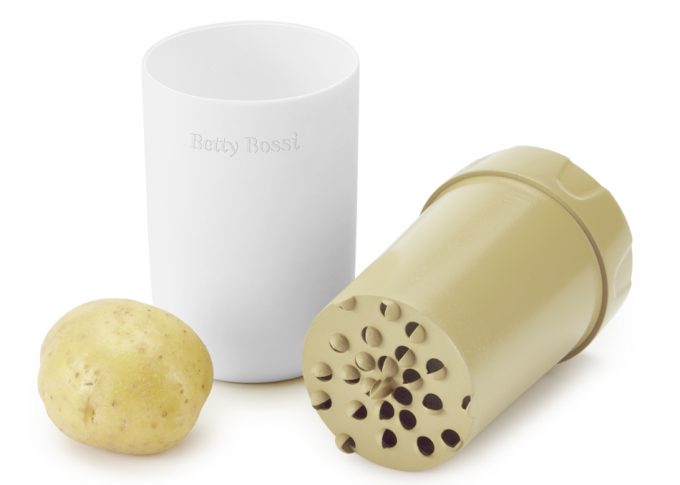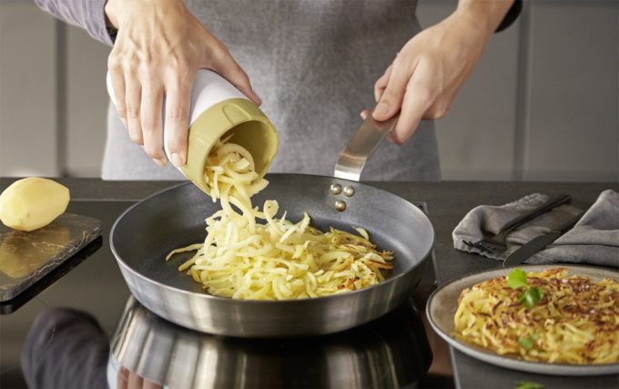 Este nuevo utensilio de cocina de la firma suiza Betty Bossi asegura proporcionar tiras largas y uniformes de patata cruda para cocinar cualquier plato clásico o innovador, y lo hace sin apenas esfuerzo, en muy poco tiempo, y lo mejor de todo, protegiendo los dedos del rallador. Además, es un rallador que cumple con su función de forma limpia, pues no ensucia la mesa de trabajo ni se tiene que manipular el alimento con las manos.
