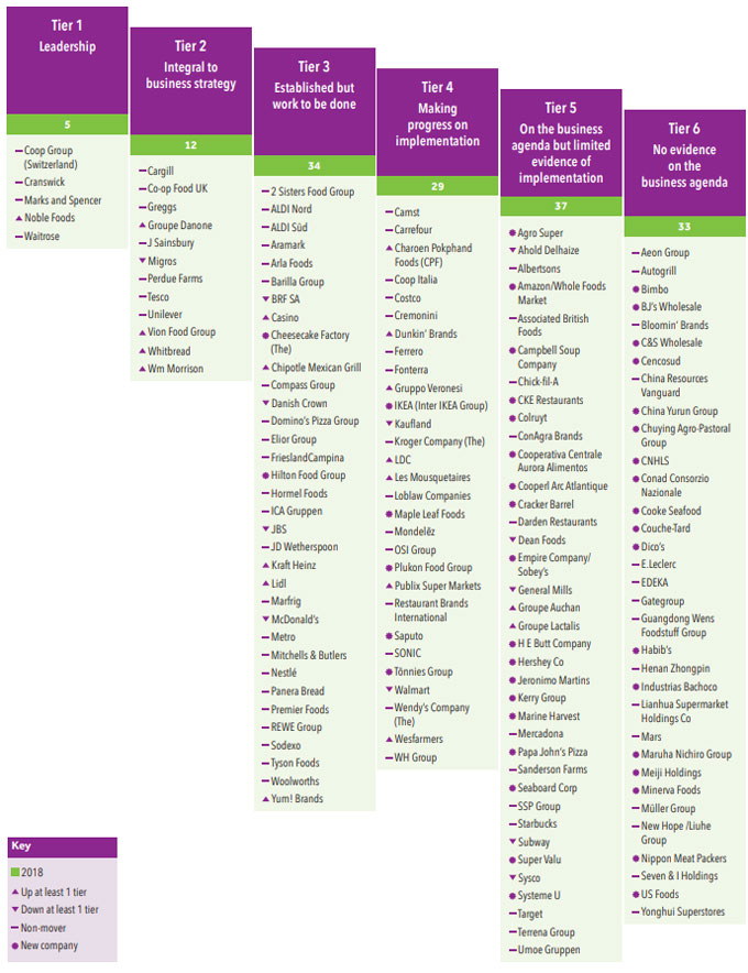Según el ranking, Coop Group, Cranswick, Marks & Spencer, Noble Foods y Waitrose se clasifican en el primer nivel, siendo las que más progresos realizan en favor del bienestar animal, Migros desaparece de esta categoría y pasa a un nivel inferior. En segundo nivel se han clasificado Cargill, Co-operative (Reino Unido), Greegs, Grupo Danone, J. Sainsbury, Migros, Perdue Farms, Tesco, Unilever, Vion Foof Group, Whitbread y Wm Morrison, desaparecen de este nivel compañías como McDonald’s que pasan al tercer nivel.