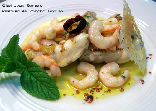 Nadie puede resistirse ante un Rape a la plancha con gambas al ajillo y crujiente de queso, ni tampoco a probarlo en el Restaurante Rancho Texano de Madrid, donde su chef y creador, Juan Romero, nos explica que es uno de los platos más valorados y con los que han conseguido que su restaurante aparezca como recomendado por la Guía Michelin 2009 de España y Portugal.