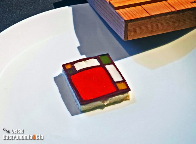 Brandada de bacalao convertida en una mousse, aceituna negra, pimiento y crema de leche a modo de gelatina… El plato, el Mondrian gastronómico, parece un elemento decorativo, además, se presenta cubierto con una ‘caja’ como si fuera una obra de arte. Pero es totalmente comestible y estamos seguros de que tiene el sabor que el cocinero ha buscado.