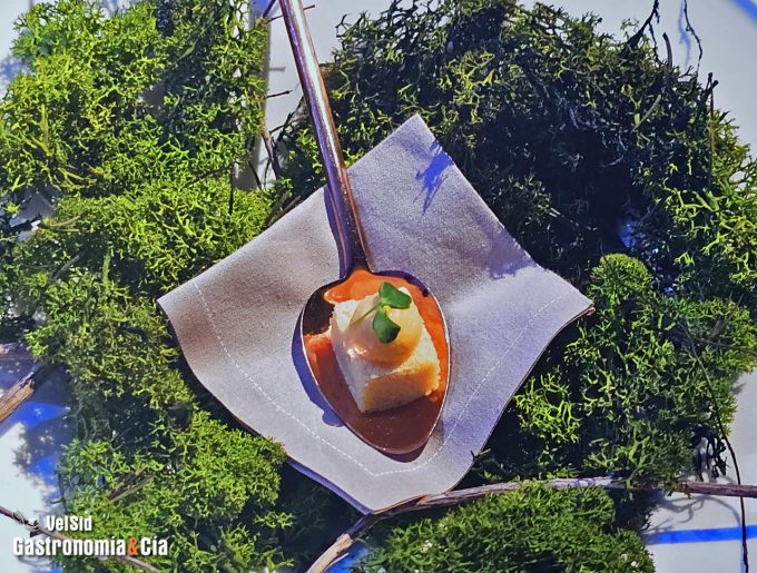 Es un homenaje al Perú, concretamente al Machu Picchu, que se encuentra a más de 2.400 metros de altitud. Consiste en un biscuit de maíz y almendra, lo que viene a ser una polenta, a la que añade un punto de puré de maíz y sriracha para aportar un toque picante y un brote de calabaza. Como habéis visto, este bocado se presenta en una cucharilla rodeada de musgo. Pero la degustación no termina ahí, porque cuando se retira el plato de la mesa, debajo continúa el estudio del maíz.