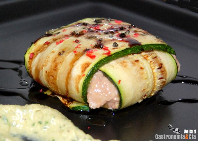 Lava los calabacines y córtalos en finas láminas a lo largo, puedes utilizar una mandolina para ello. Haz las láminas de calabacín a la plancha con un poco de aceite y sal, haz también las láminas desiguales de los primeros cortes del calabacín que después servirán para hacer la salsa.