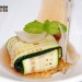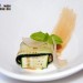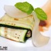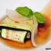Prepara los ravioli poniendo dos láminas de calabacín en forma de cruz, dispón en el centro una cucharada de carne de cordero y cierra el ravioli posando una a una las cuatro puntas de calabacín.