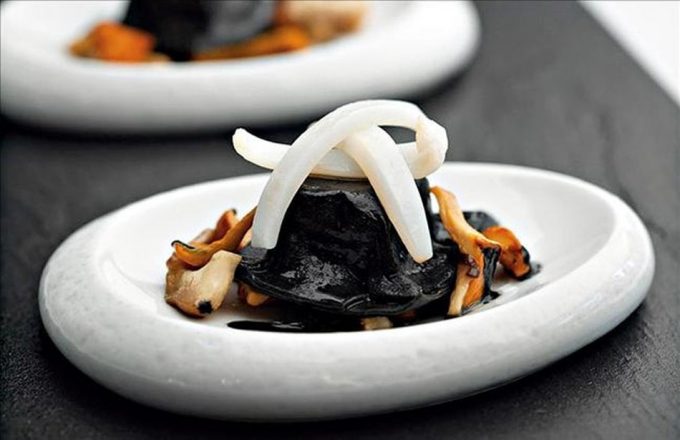 En este caso se trata de un plato de alta cocina, por lo que no es para llenarse el plato de raviolis, aunque siempre podéis tomar la idea de este plato para hacer vuestra versión al gusto. La pasta está hecha con tinta de calamar, el relleno del ravioli lleva trompeta de la muerte y boletus, se acompaña de un poco de calamar fresco y salsa de cebolla y tinta… el resultado tiene que ser delicioso. Y aunque será una receta que llevará un ratito en la cocina, la satisfaccion del cocinero cuando ve disfrutar a sus comensales, lo paga. Así que tomad nota de este ravioli relleno de setas y calamar de Raül Balam, hijo de Carme Ruscalleda, y a cocinar.