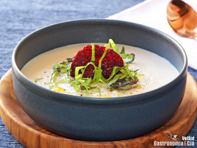 Sirve el ajoblanco de remolacha blanca en platos hondos o cuencos y guarnece con lo que más te guste, pueden ser unos taquitos de jamón, unos dados de aguacate y un filete de anchoa troceada, unos picatostes, o, si quieres una opción original, puedes optar por chips de remolacha y unas hojas de shiso verde y morado, como hemos puesto nosotros. ¡Buen provecho!