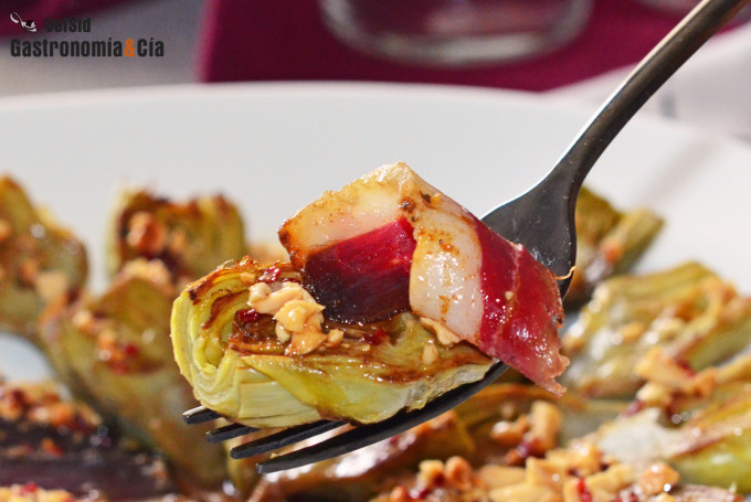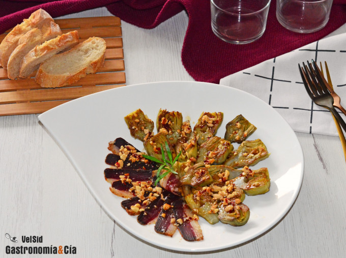 Ya tenéis una nueva propuesta para el próximo aperitivo, pero no esperéis al fin de semana para hacerlo porque cuanto antes lo probéis, antes querréis repetir. Una buena idea es cocinar alcachofas de sobra para poder hacer esta tapa la próxima vez con menos esperas, es lo que hicimos nosotros, pues las cocinamos cuando preparamos esta receta de pulpo con alcachofas que compartimos con vosotros la semana pasada. Y hoy os traemos nuestra receta de alcachofas con jamón de pato y vinagreta de almendras y ajos confitados que, dicho sea de paso, también puede ser una buena opción para cenar, ¿qué tal un plato por comensal?