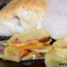 Pela las patatas y córtalas en rodajas finas, pela la cebolla y córtala en juliana. Dispón ambos ingredientes en una bandeja de horno untada con aceite de oliva, salpimenta al gusto e introduce en el horno durante diez minutos aproximadamente, que las patatas no terminen de hacerse.