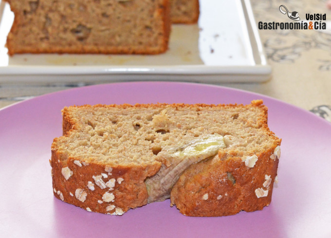 Introduce el molde en el horno caliente a 180º C con calor arriba y abajo, y hornea durante 40 minutos o hasta que al pinchar con un palillo, éste salga limpio. Entonces, retira el banana bread del horno y deja enfriar antes de desmoldar.