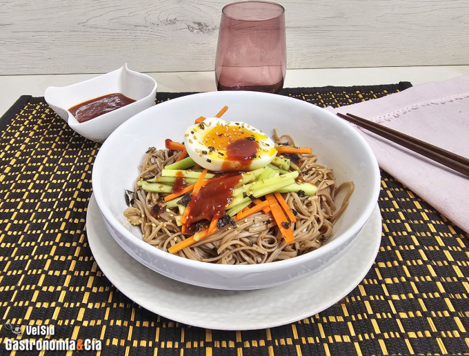 Sirve los fideos fríos en un plato hondo o un bol, añade sobre ellos la salsa de gochujang y corona con la zanahoria, el pepino y el medio huevo. Si quieres poner más toppings, puedes tostar unas hojas de alga nori y desmenuzarlas, así como espolvorear unas semillas de sésamo. El resto es comer y disfrutar. ¡Buena cocina y buen provecho!
