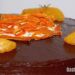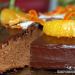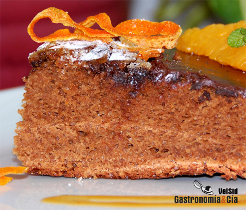 Desmolda el bizcocho, pon un aro en el centro y pinta el exterior con el chocolate fundido y espolvorea con azúcar glass el interior. Pela los gajos de la naranja a lo vivo y decora con ellos el bizcocho, puedes bañarlos en un poco de caramelo de naranja si lo deseas. Decora finalmente con las pieles de naranja confitadas el centro del bizcocho de chocolate y naranja.