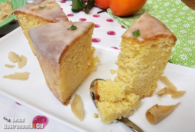 Reparte el glaseado cítrico sobre el bizcocho y si lo deseas, decora la superficie con piel de cítricos o con unas hojas de hierbabuena fresca. El resto es compartir, comer y disfrutar. ¡Buena cocina y buen provecho!