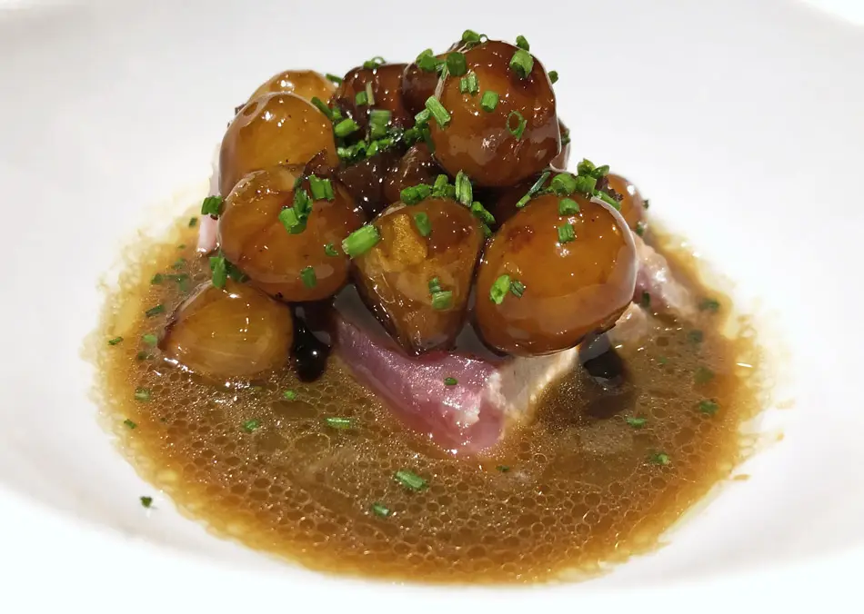 En un plato hondo servimos la salsa ponzu. Después de meter el lomo de bonito dos minutos en el horno, lo colocamos sobre la salsa y lo cubrimos con las cebollas grelots glaseadas. Para terminar, añadimos el cebollino picado.