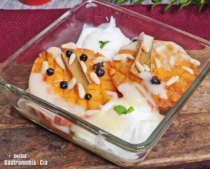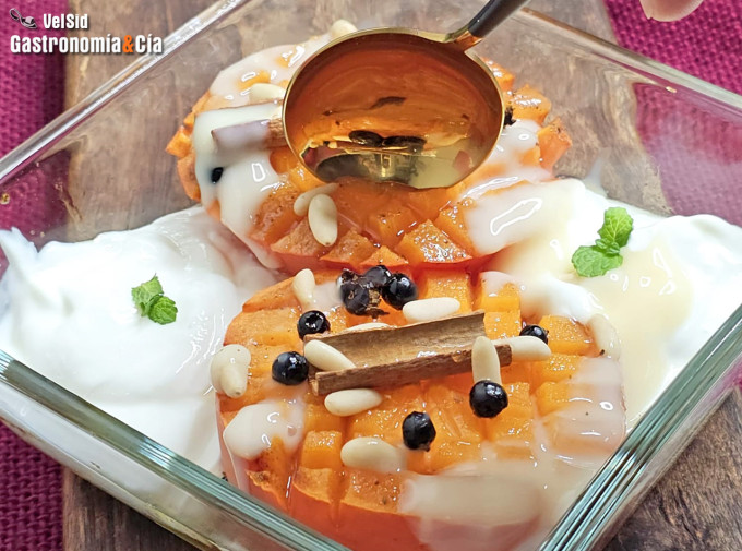 Sirve el persimon asado recién hecho con los piñones, después de regarlo con la miel que, tras la cocción, estará más líquida. Acompaña con el yogur griego (no hace falta endulzarlo) y la crema pastelera. El resto es comer y disfrutar. ¡Buena cocina y buen provecho!