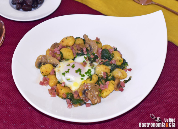 Si tenéis especial interés en cocinar en sólo un recipiente (como anima Jamie Oliver en su libro ‘One Pot’) por el motivo que sea, esta receta es para vosotros, se trata de nuestra cazuela de ñoquis con espinacas, champiñones, huevo y un toque de jamón que le va que ni pintado, el resultado ya os podéis imaginar que es puro sabor, además hay equilibrio y es un festival para los paladares más exigentes.