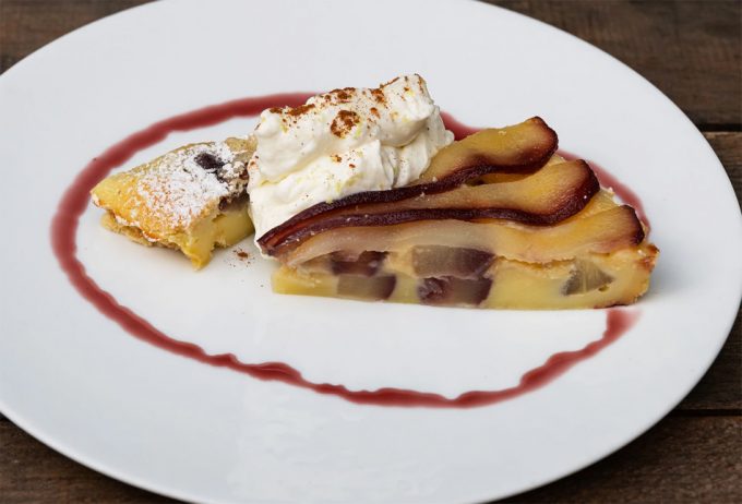 Ya sabéis que la clafoutis es una tarta de origen francés que tradicionalmente se elabora con una sencilla masa a base de huevos, harina, mantequilla, azúcar y leche o nata, es una masa como la de las crêpes, se vierte en un molde y se rellena de cerezas. Claro, que también se hace con otras frutas como os comentamos en este post, entonces la tarta se conoce como flognarde. De todos modos, los cocineros creativos que hacen sus recetas inspirándose en otras, nos presentan recetas como la que hoy tenemos en la sección ‘Recetas de los Chefs’.