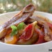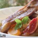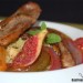 Lava los higos, el tomate verde y el caqui y córtalos en gajos. Pela la cebolla y córtala igual, pon un poco de aceite de oliva en una sartén y fríe primero el tomate, dándole la vuelta y sazonándolo al gusto, añade la cebolla y rehoga unos minutos más, hasta que empiece a estar tierna, riega entonces con el zumo de limón y la miel y reduce el fuego, deja cocer hasta que casi tengas una salsa caramelizada. Incorpora entonces el caqui y los higos, salpimenta, mezcla bien y deja hacer un minuto más. Reserva.