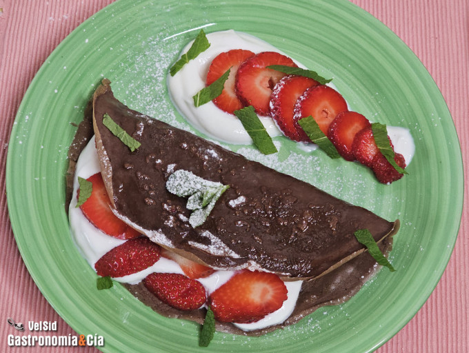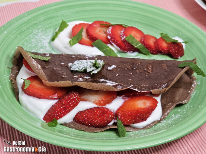Rellena las crepes de chocolate saludables con el yogur, las fresas en rodas y la hierbabuena picada y sirve enseguida. El resto es comer y disfrutar. ¡Buena cocina y buen provecho!