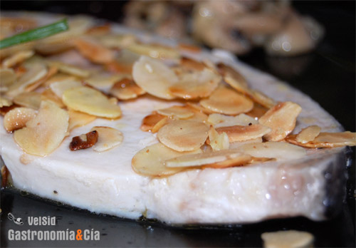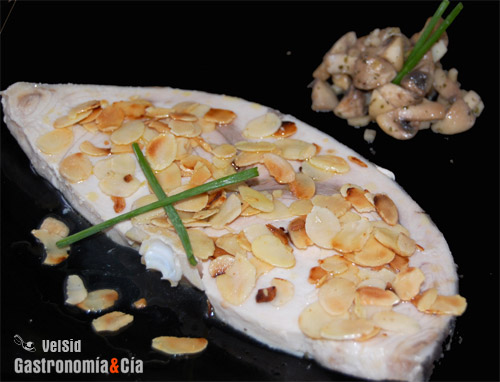 Sirve las rodajas de emperador y cúbrelas con las almendras tostadas, acompaña con los champiñones y a disfrutar de este sencillo y saludable plato.