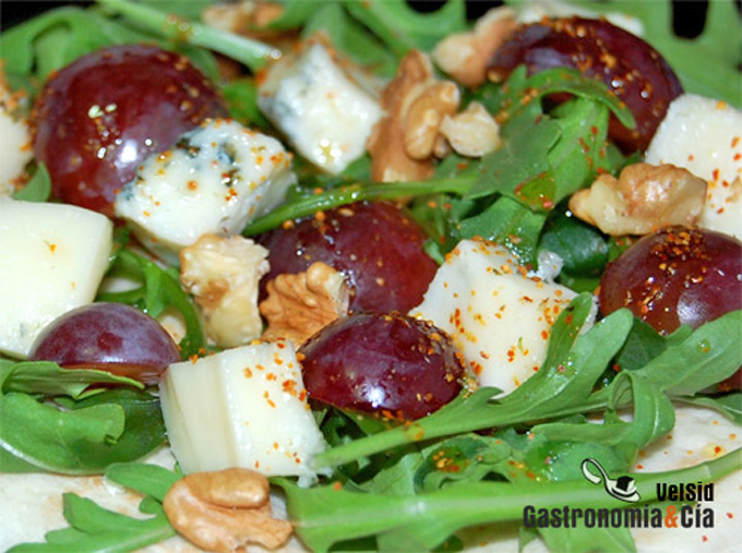 Anoche nos preparamos una Ensalada de rúcula, gorgonzola y uvas sobre pan naan, una cena sencilla y rápida de hacer, pero saludable y muy rica. El pan lo habíamos hecho a primera hora de la tarde, por lo que todavía conservaba su corteza crujiente. Aquí tienes nuestra receta de pan naan, y ahora vamos a por la ensalada, muy recomendable.
