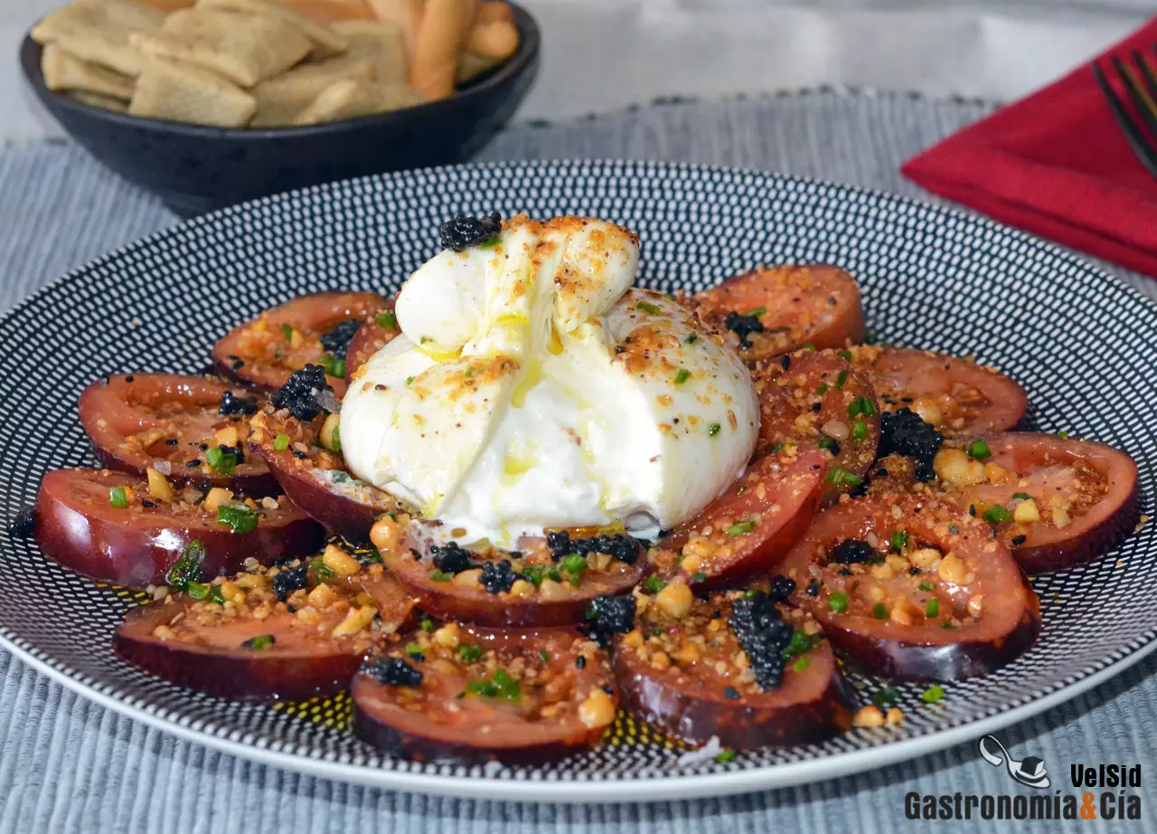 Si os preguntáis qué es la dukkah, os recordamos que esta mezcla de especias y frutos secos la preparamos hace poco y también tenéis la receta en este post, os prometimos que os daríamos varias ideas para incorporarla en los platos y aquí tenéis una más que os va a encantar. Al final, un clásico como es la ensalada de tomate y burrata, normalmente aromatizada con albahaca, se convierte en un plato totalmente distinto y extremadamente sabroso, además de nutritivo y saludable, así que no dudéis en tomar nota de esta receta de tomate con burrata, dukkah de avellanas y huevas de arenque, y disfrutad.