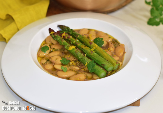 Sirve en un plato grande las alubias braseadas, coloca encima los espárragos verdes y ralla piel de limón sobre el conjunto del plato. Si lo deseas, puedes añadir un hilo fino de aceite de oliva virgen extra, pimienta recién molida y cilantro fresco. El resto es comer y disfrutar. ¡Buena cocina y buen provecho!