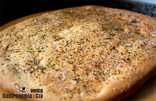Esta es una versión de la receta de focaccia que hacemos a menudo, hay tantas que vamos probando y lo malo es que siempre salen buenas. Esta elaboración es de las rápidas, con un solo levado.