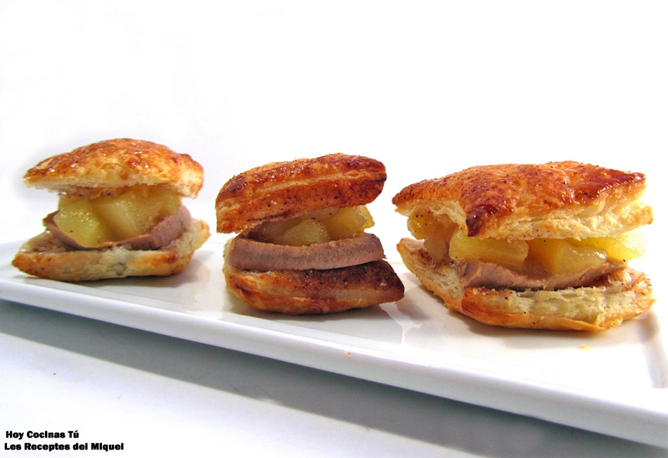 Las láminas de manzana, peladas, conviene que sean finitas y el foie, lo que tu paladar acepte, pero dale un buen grosor.