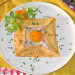 Dobla la crepe para darle la forma clásica, son cuatro dobleces para dejar que quede cuadrada y sin cubrir la yema con la masa. Es fácil que quede bien doblada y adherida gracias a la clara de huevo y al queso fundido. La yema de huevo debe quedar fluida, sin cuajar. No obstante, las personas que no quieran o no puedan comer la yema de huevo cruda, pueden darle la vuelta o tapar la sartén y cocinar hasta que cuaje del todo.