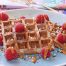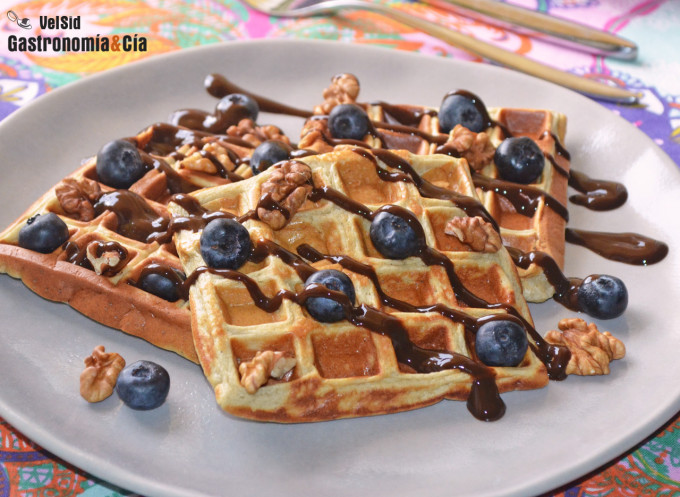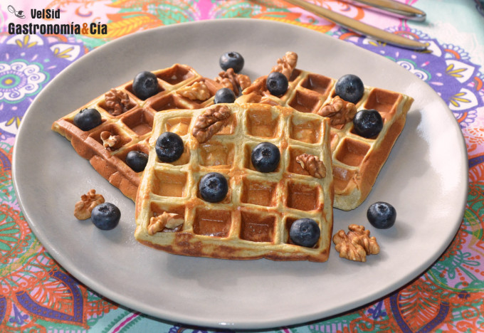Cuando la gofrera esté en marcha, vierte la masa en las cavidades, ciérrala y deja que se hagan los gofres hasta que estén dorados, o hasta que el aparato indique que ya están hechos. Entonces, retira los gofres cuidadosamente para que no se rompan.