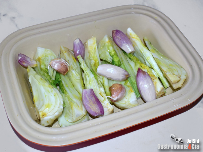 Limpia el bulbo de hinojo fresco y córtalo en octavos. Pela las chalotas y córtalas en cuartos. Da un golpe a los dientes de ajo y coloca todo en una bandeja de horno.