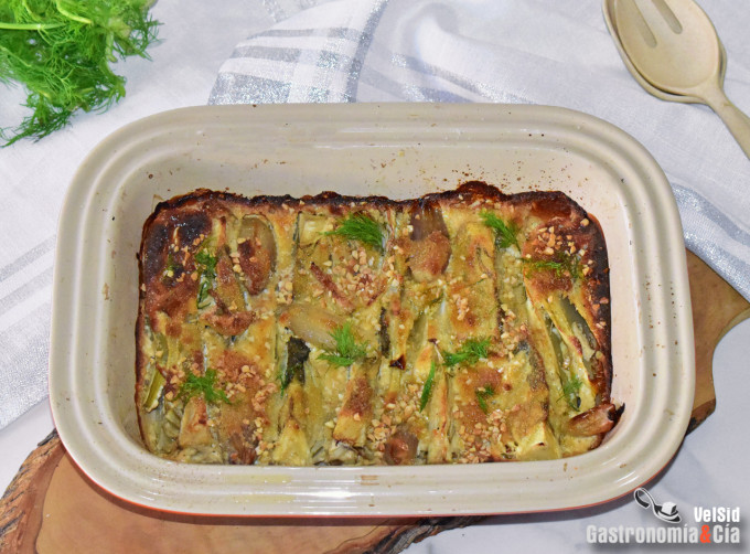 Con el majestuoso jarrete de ternera que preparamos y cuya receta podéis recordar en este post, se pueden servir infinidad de guarniciones, pero os vamos a proponer que probéis una muy sencilla de preparar y que resulta deliciosa, además de original. La idea la tomamos del cocinero británico Jamie Oliver (aunque la hemos cambiado bastante), y como habéis leído en el titular, se trata de Hinojo gratinado, ¿quién se puede resistir a unas verduras con queso tostadito, aromático, ligeramente crujiente, sabroso…?