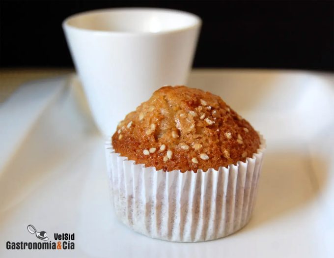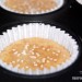 Pasado este ratito, vierte la masa en los moldes para magdalenas (de silicona o de papel), añade unas semillas de sésamo sobre la masa y espolvorea un poco de azúcar. Introduce la bandeja con las magdalenas en el horno y baja la temperatura a 180º C.
