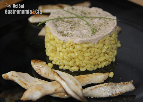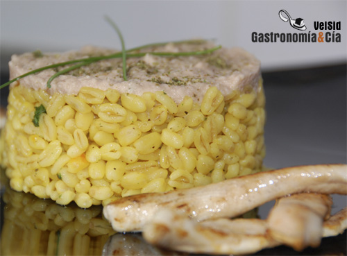Coloca un aro de emplatar y rellena con el trigo, sobre él dispón una capa de puré de manzana y acompaña con las tiras de pechuga de pollo. Ya está a punto para servir.