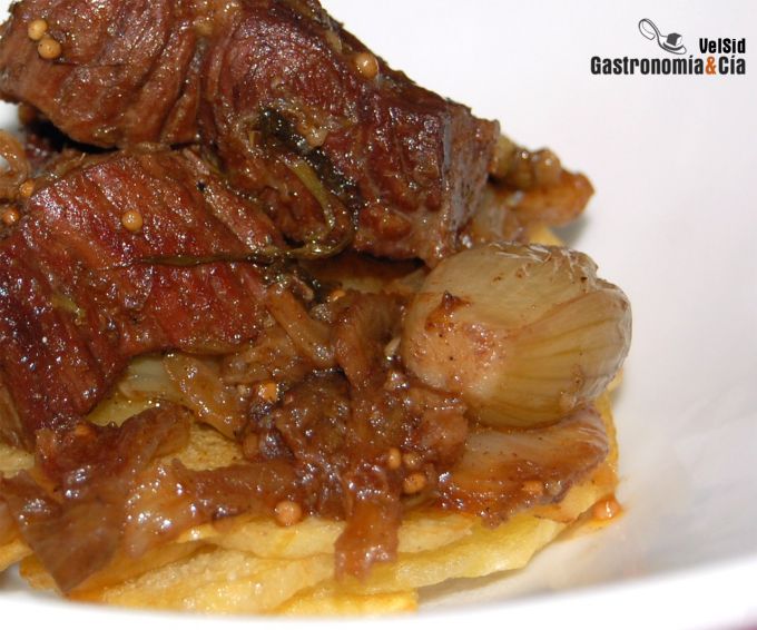Sirve una cama de patatas y sobre ellas coloca el morcillo con las chalotas, el hinojo y los ajos. Sirve enseguida acompañado de un buen pan y un vino al gusto. ¡Buen provecho!