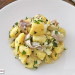 El momento del aliño es crucial, y es donde reside el verdadero ‘arte’ de las papas aliñás (aunque en este vídeo no lo honramos). El almidón de la patata es más permeable y absorbente cuando aún está caliente. Así que una vez que las patatas están cocidas, escúrrelas y déjalas templar lo justo para poder manipularlas sin quemarte. Pélalas y córtalas con cuidado en dados de bocado.