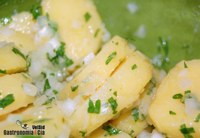 Mezcla bien para que todas las patatas se impregnen del aliño, cubre el recipiente con film transparente dejando un pequeño escape para el calor y deja enfriar a temperatura ambiente.
