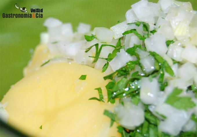 Cuando las patatas estén cocidas, retíralas del agua y mientras pierden un poco de calor para poderlas pelar, prepara el resto de ingredientes. Pela la cebolleta y pícala en brunoise, lava el perejil y pícalo también.