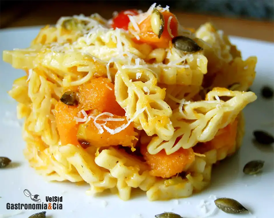 Cuando la pasta esté lista, escúrrela e incorpórala a la sartén con la calabaza, agrega las pipas de calabaza, da un par de vueltas para que se mezclen todos los ingredientes.