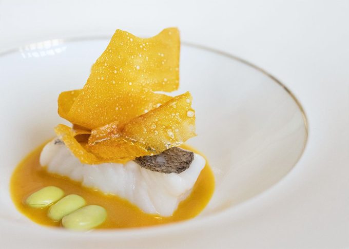 Servir la emulsión del amarillo, colocar la pescadilla cocinada al vapor, al lado las habas repeladas y coronar con el cristal de patata.