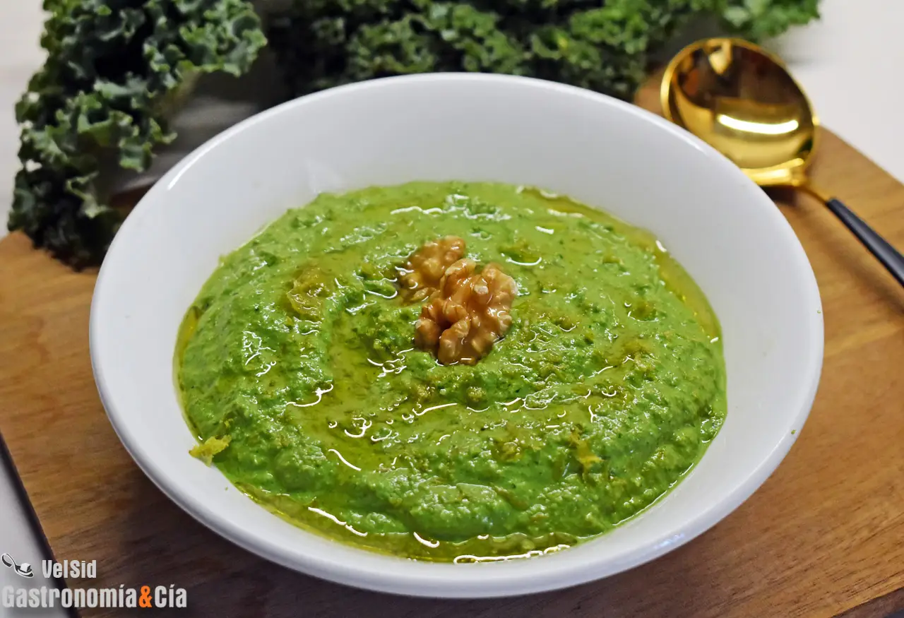 Uno de los platos principales que vamos a hacer estas fiestas es corvina al horno con su guarnición de hortalizas, patatas y demás, pero también queremos servir una salsa porque en nuestra familia las disfrutan mucho. Claro, también queremos ofrecerles algo que no hayan probado y como veréis, no hace falta complicarse demasiado porque ya hemos decidido que vamos a preparar esta receta de pesto de kale con nueces y lima.